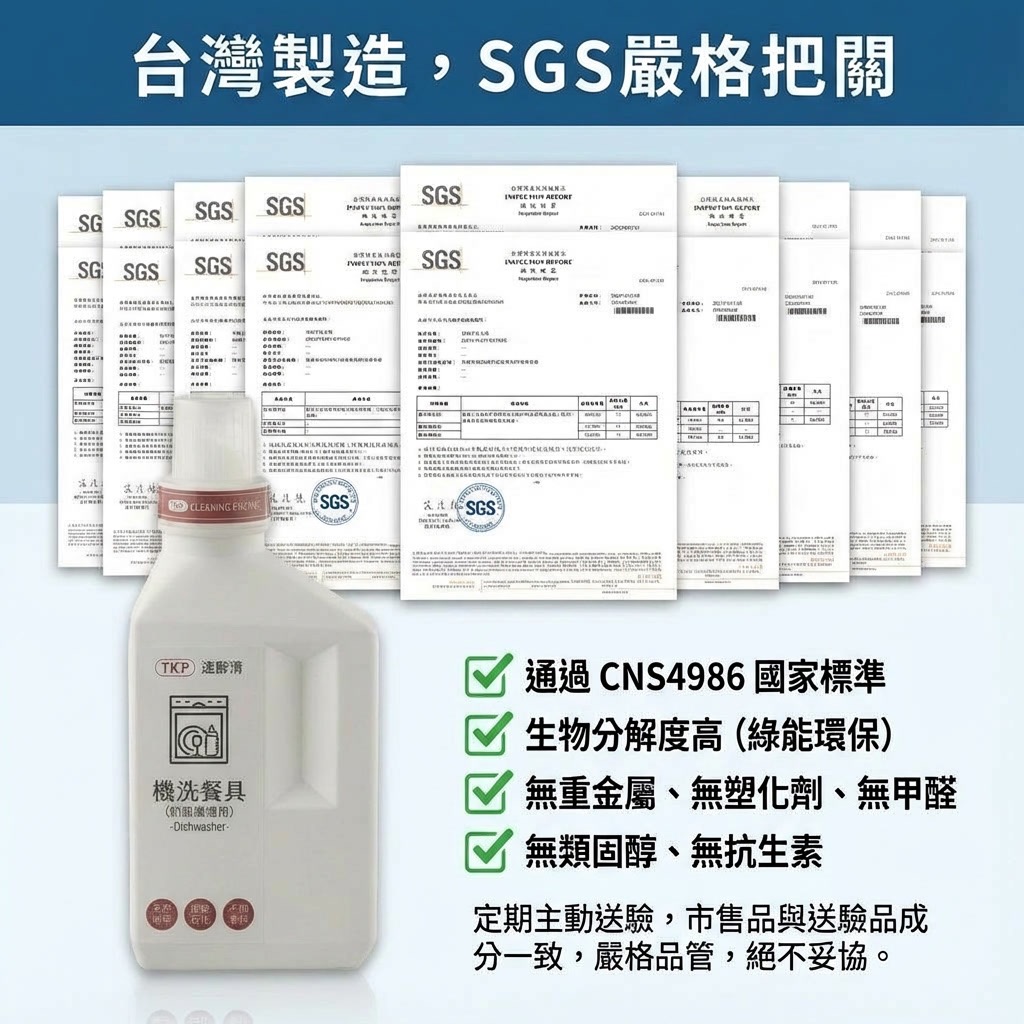 旗下產品定期主動送至SGS檢驗,通過化粧品衛生法規檢測,不含類固醇、抗生素、無抗藥性、不含重金屬 、塑化劑、不含螢光增白劑、抗菌劑、防腐劑、無酒精、香精與甲醛,市售TKP產品與送驗品成份相同,嚴格把關品管過程 ,有別於傳統化工洗劑