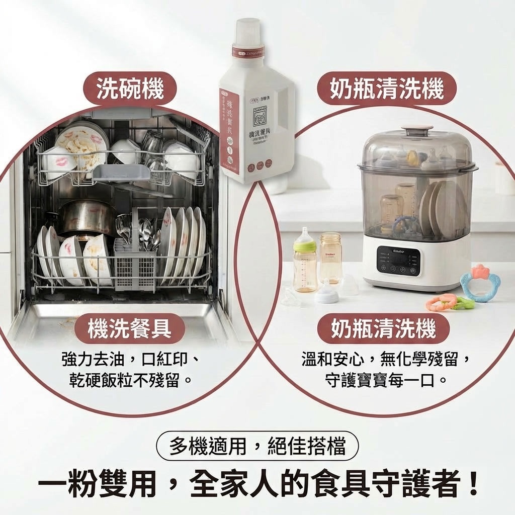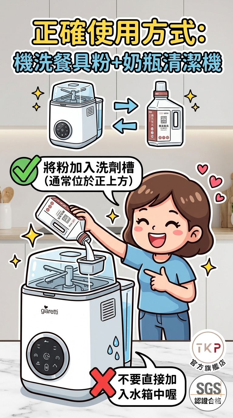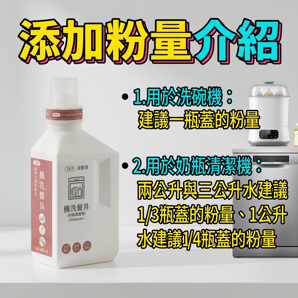 3.若使用於奶瓶清洗機,因通常奶瓶機的水量都比洗碗機少,所以最多約1/3瓶蓋即可(2公升內的1/3瓶蓋甚至更少粉)