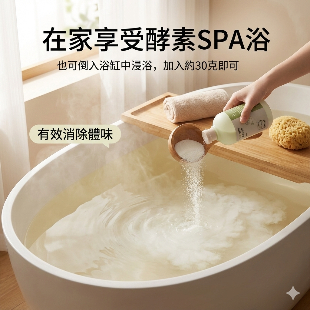 2.也可倒入浴缸中浸浴,家庭浴槽7分滿約150-200公升,加入約30克即可。