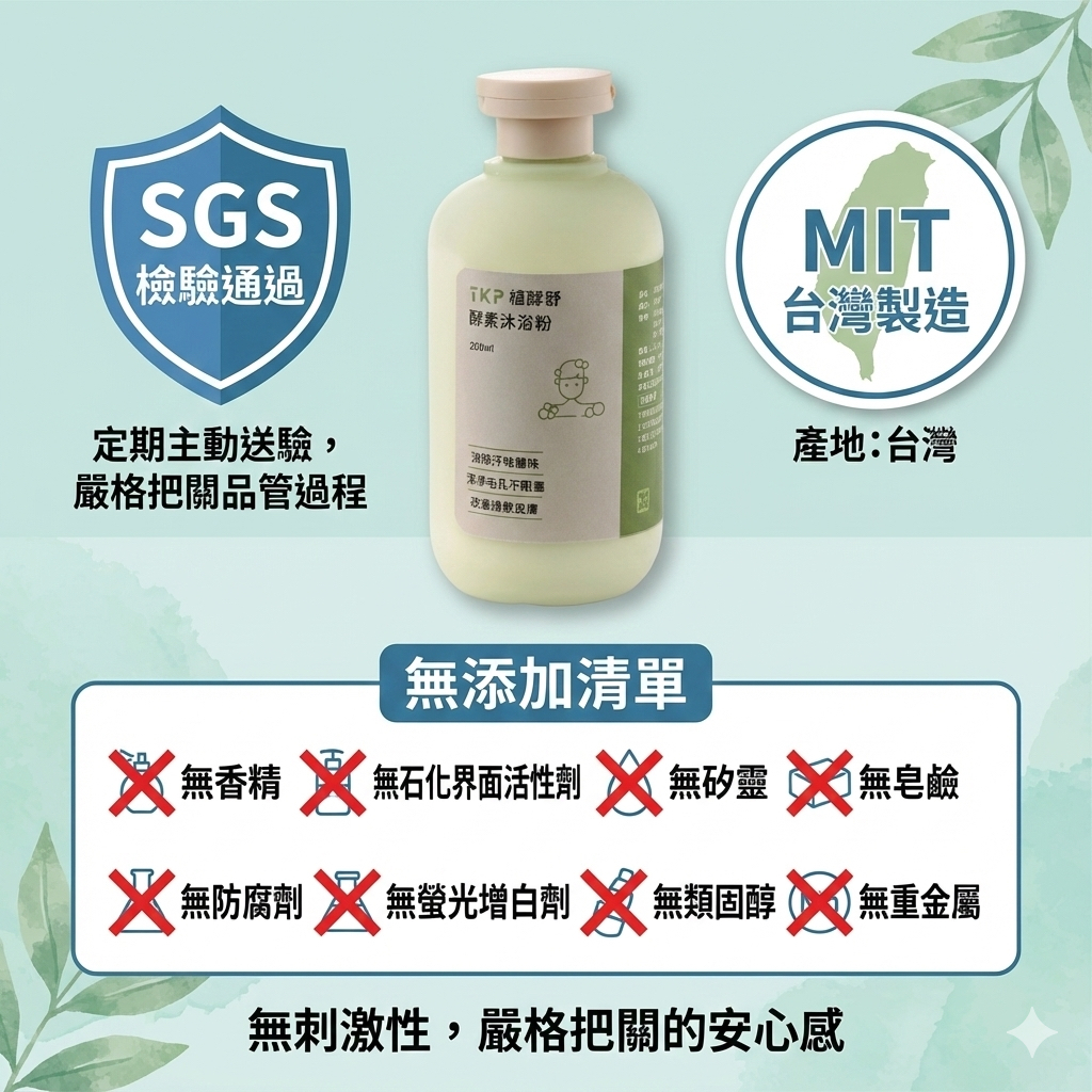 旗下產品定期主動送至SGS檢驗,通過化粧品衛生法規檢測,不含類固醇、抗生素、無抗藥性、不含重金屬 、塑化劑、不含螢光增白劑、抗菌劑、防腐劑、無酒精、香精與甲醛,市售TKP產品與送驗品成份相同,嚴格把關品管過程 ,有別於傳統化工洗劑