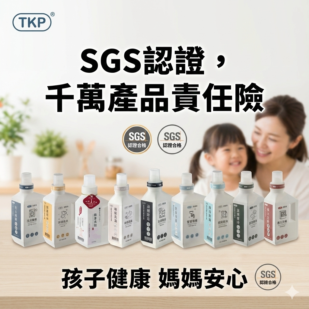 旗下產品定期主動送至SGS檢驗,通過化粧品衛生法規檢測,不含類固醇、抗生素、無抗藥性、不含重金屬 、塑化劑、不含螢光增白劑、抗菌劑、防腐劑、無酒精、香精與甲醛,市售TKP產品與送驗品成份相同,嚴格把關品管過程 ,有別於傳統化工洗劑