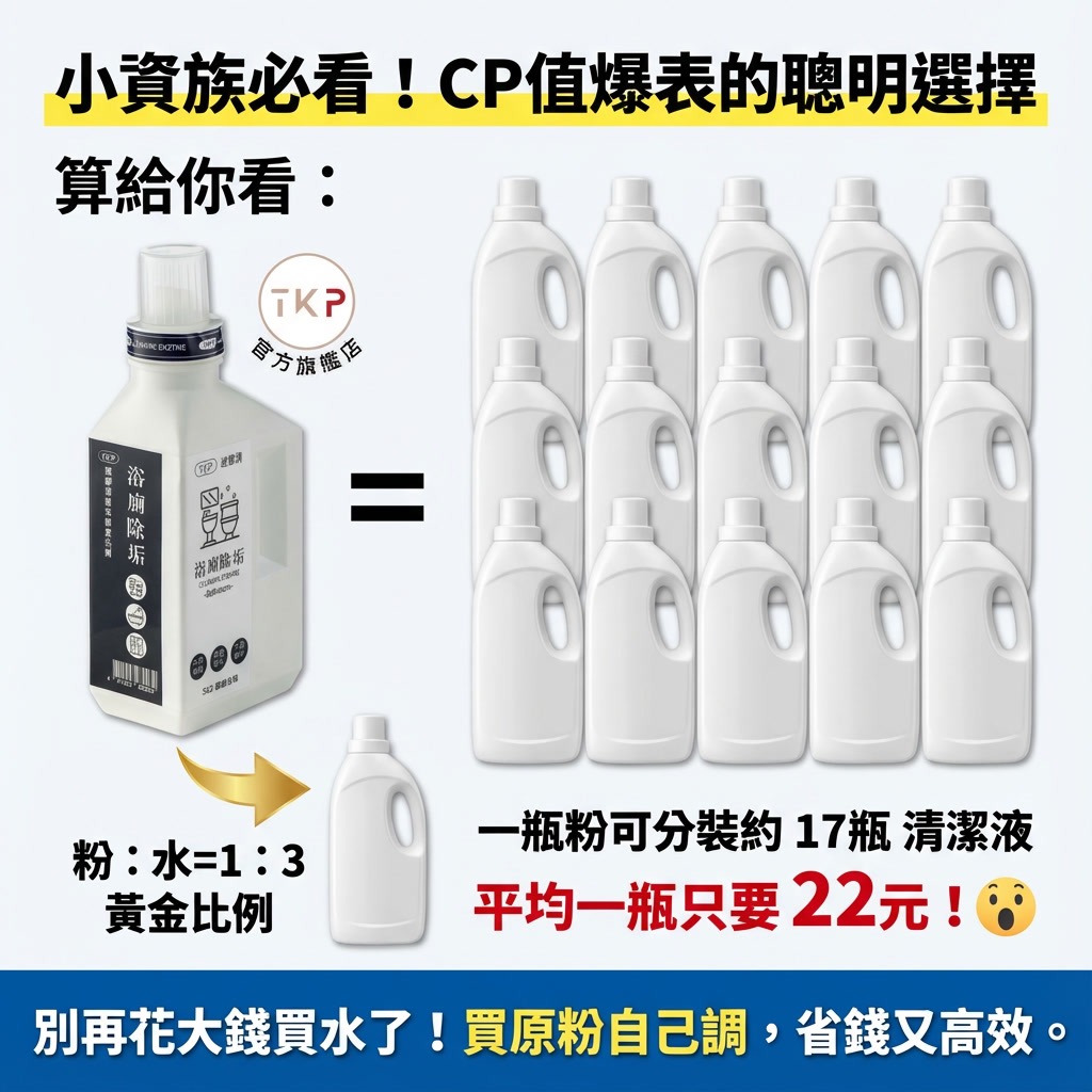 一瓶酵素浴廁除垢粉,按粉1:水3比例,可分裝約17瓶的清潔液,平均一罐只要22元. !!!!