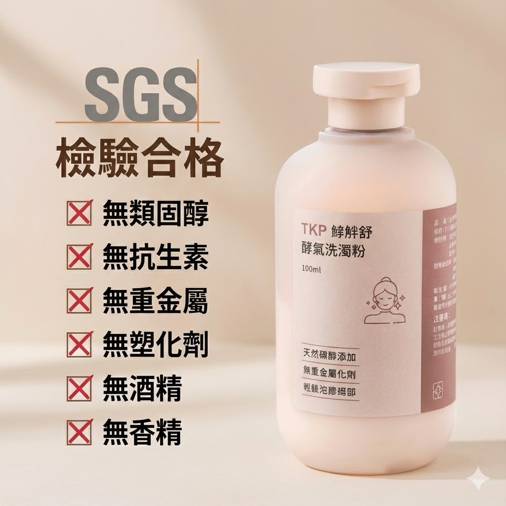 旗下產品定期主動送至SGS檢驗,通過化粧品衛生法規檢測,不含類固醇、抗生素、無抗藥性、不含重金屬 、塑化劑、不含螢光增白劑、抗菌劑、防腐劑、無酒精、香精與甲醛,市售TKP產品與送驗品成份相同,嚴格把關品管過程 ,有別於傳統化工洗劑