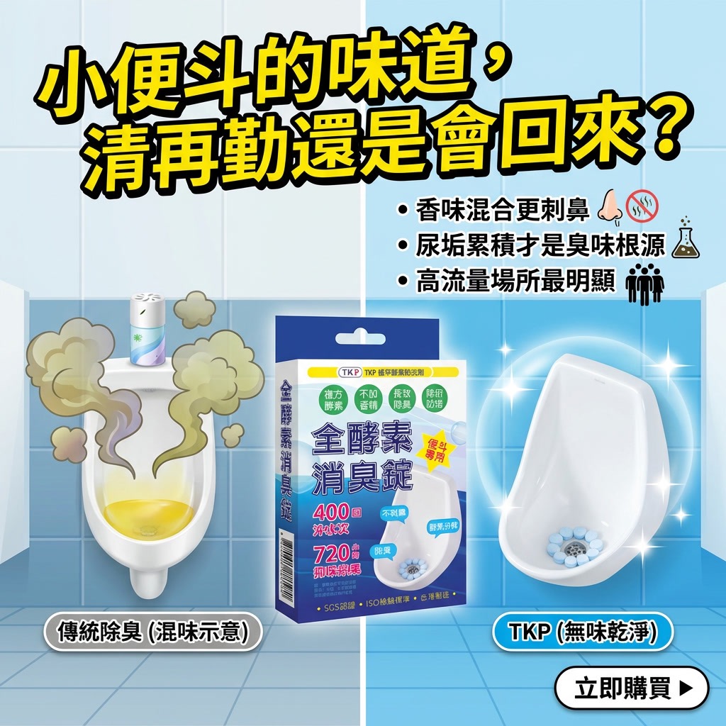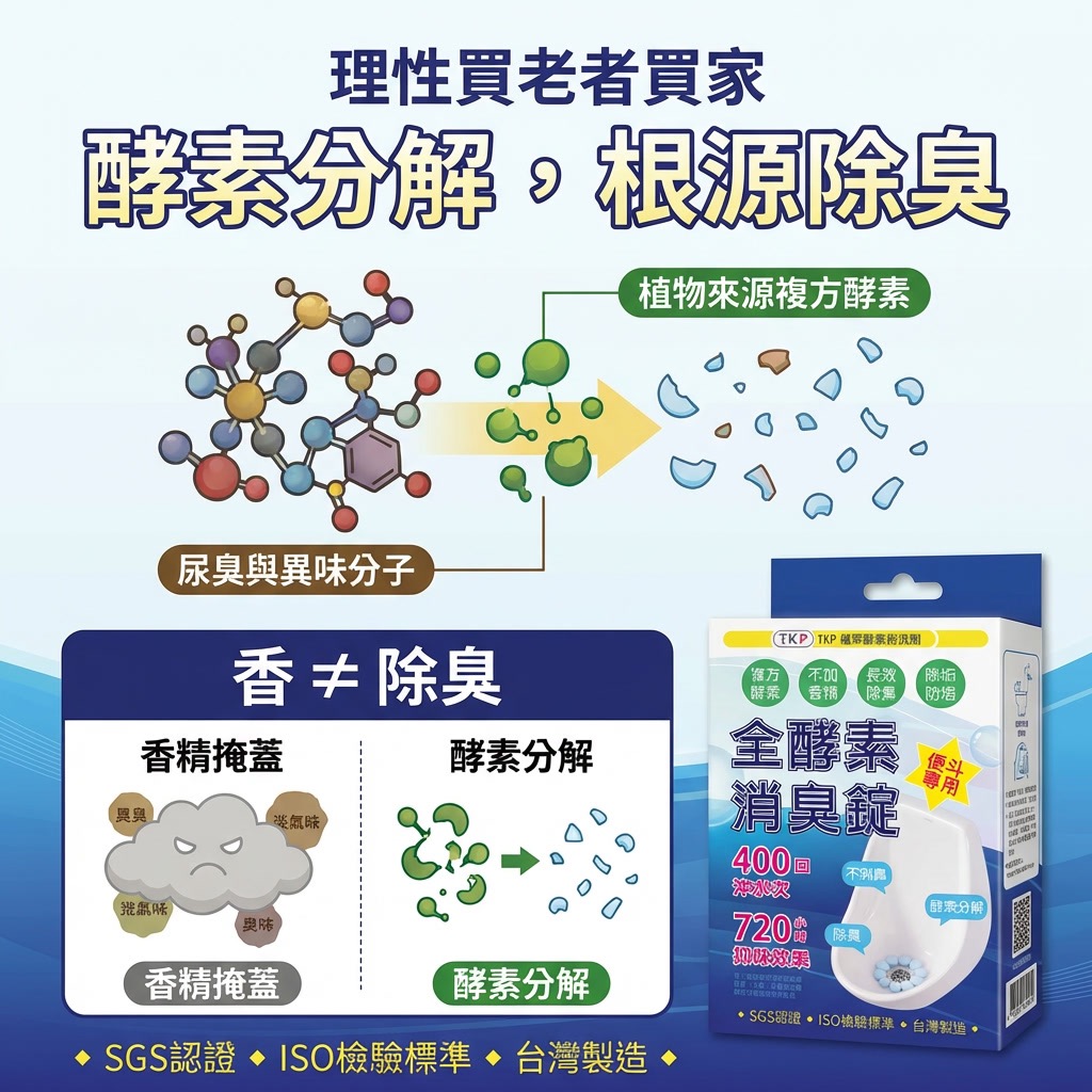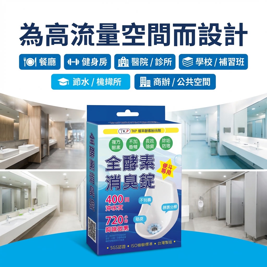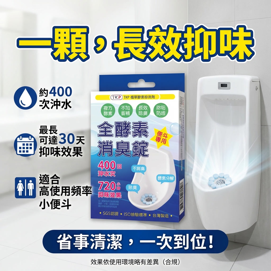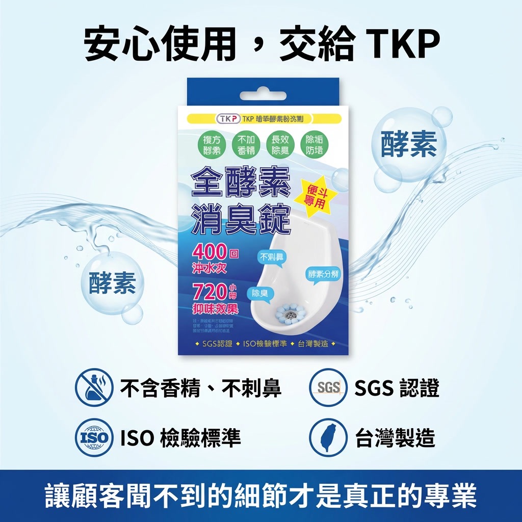TKP 全酵素消臭錠,不是混味,而是從源頭分解尿臭,專為高使用頻率的小便斗設計,讓空間真正「沒有味道」。